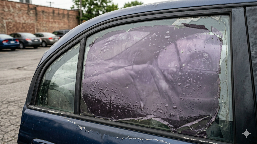 When window tint fails, some drivers attempt to remove it themselves. While DIY removal is possible, it often leaves behind stubborn adhesive residue and can damage defroster lines on rear windows.